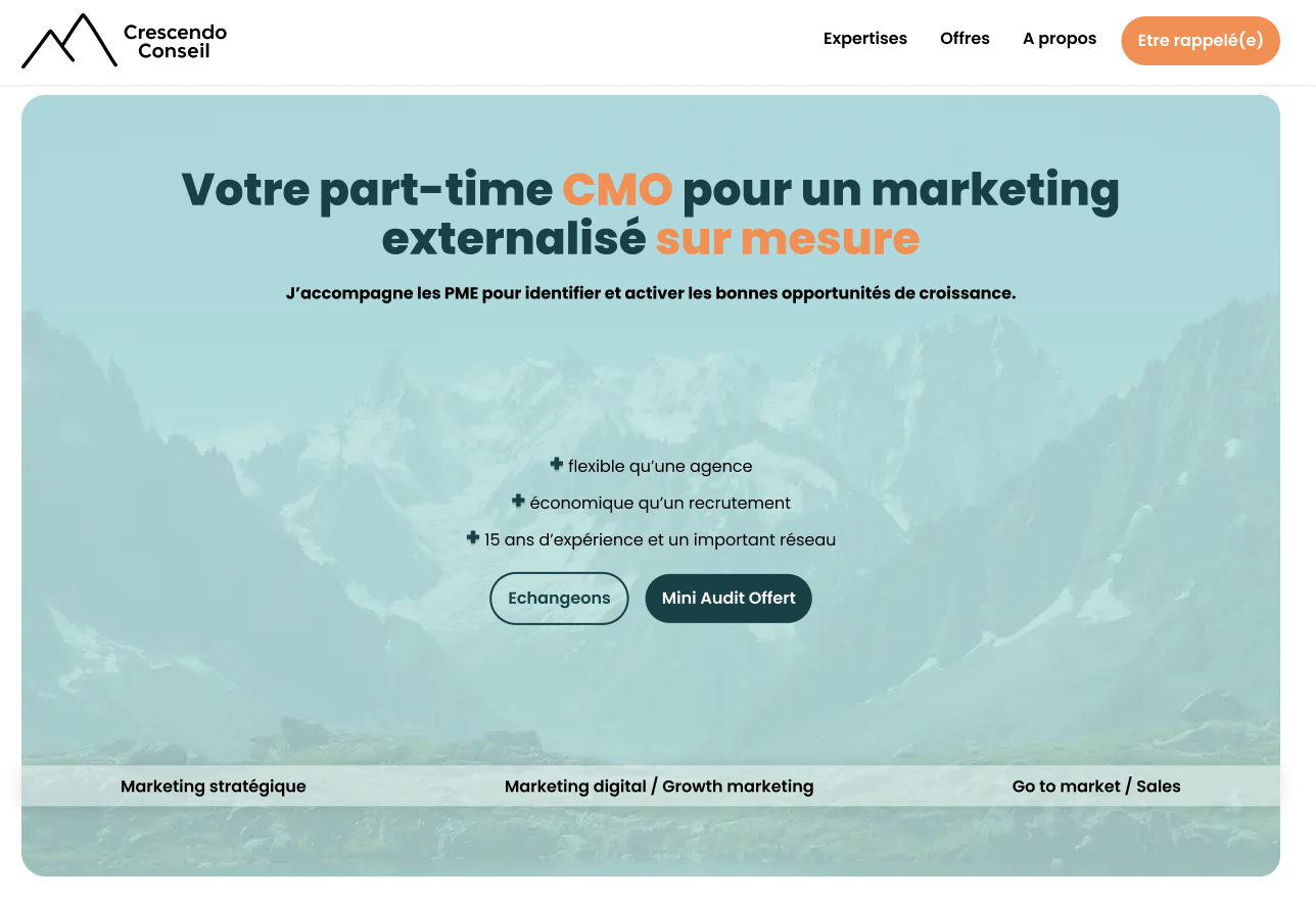 Céline Cachat est CMO externalisée, elle propose avec Crescendo Conseil un accompagnement pour les PME en Marketing Stratégique, Growth, Digital et Go to Market. Une solution flexible, économique et de grande qualité qui répond à un besoin et qui jusqu'ici rayonnait par recommandations.